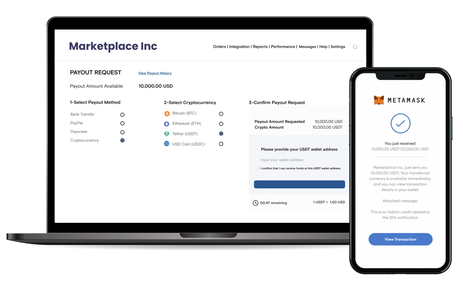 Process digital currency payouts directly on the Triple-A merchant dashboard.